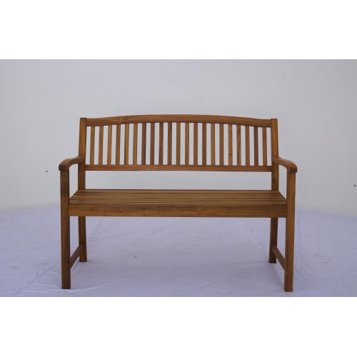 A 120x61x88cm bench made from 100% FSC-certified acacia wood, finished with an oil teak-look for a natural appearance. The bench features galvanised steel hardware for added durability, making it ideal for outdoor use.